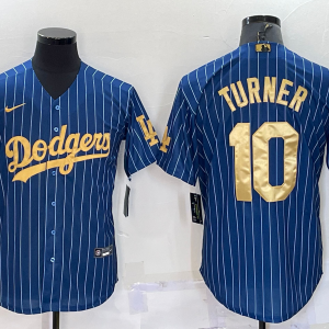 Men Los Angeles Dodgers #10 Justin Turner Navy Gold Cool Base Stitched Baseball Jersey