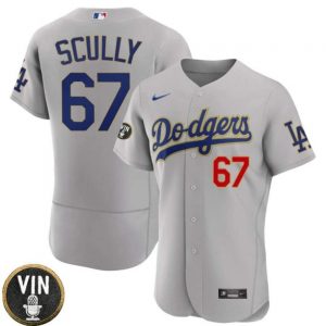 Men Los Angeles Dodgers #67 Vin Scully 2022 Grey Vin Scully Patch Flex Base Stitched Baseball Jersey