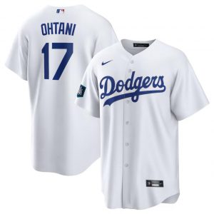 Men Los Angeles Dodgers #17 Shohei Ohtani White/Blue Vin Patch Cool Base Stitched Baseball Jersey