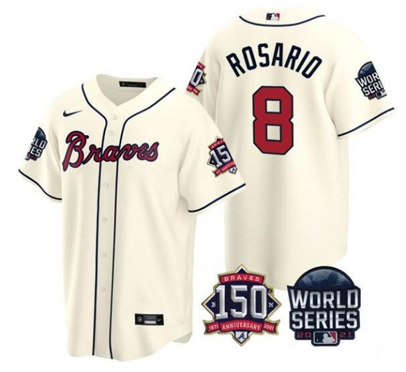 Men Atlanta Braves #8 Eddie Rosario 2021 Cream World Series With 150th Anniversary Patch Cool Base Stitched Jersey
