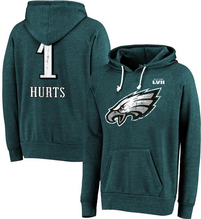 Men Philadelphia Eagles #1 Jalen Hurts Midnight Green Super Bowl LVII Name & Number Pullover Hoodie